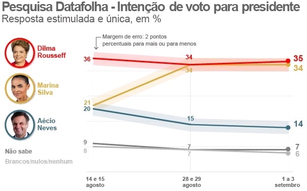 Pesquisa eleitoral dos dias 14 de agosto a 3 de Setembro, Marina aparece com quase a mesma pontuação de Dilma;