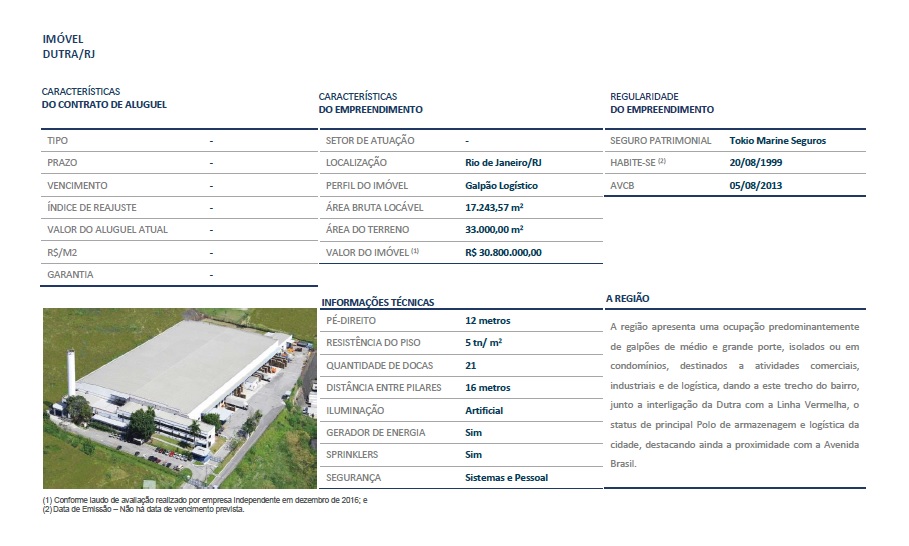 Esse fundo, possui participação em 6 galões logísticos, distribuídos entre 3 estados brasileiros. Mais especificamente, São Paulo, Rio de Janeiro e Santa Catarina.