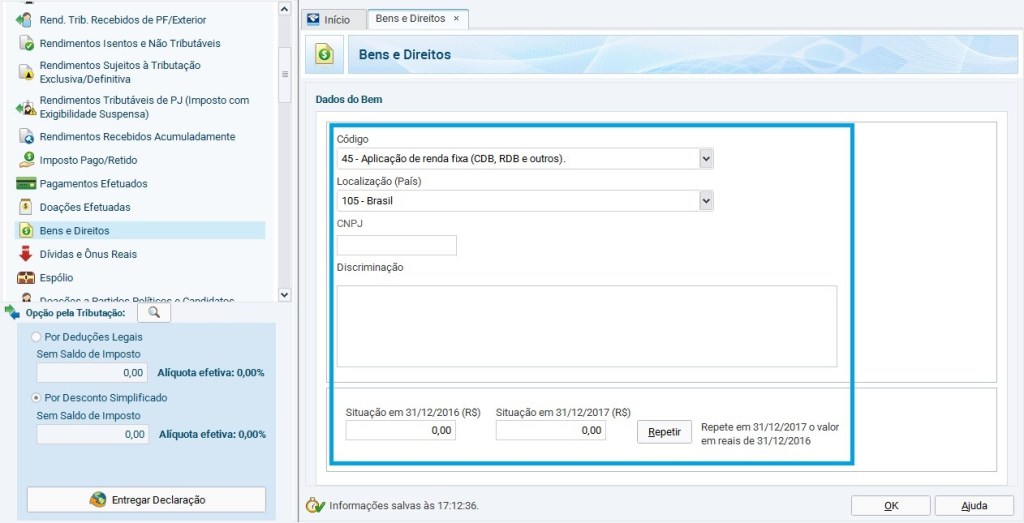 Dentro da aba de Bens e Direitos, o investidor deverá escolher a opção 45 (Aplicação de renda fixa).