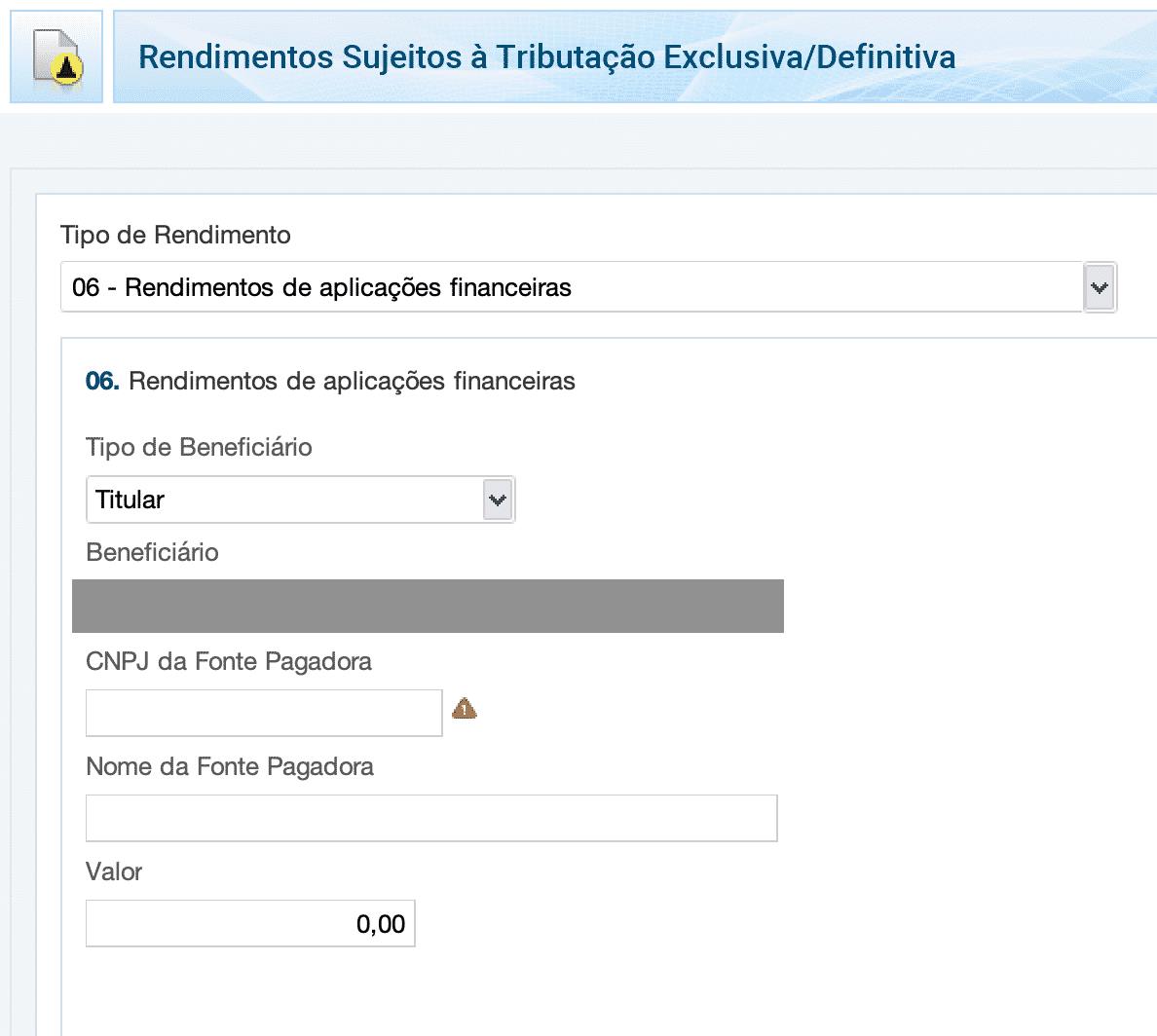Dentro dessa aba, será necessário incluir os valores na ficha de código 06 (Rendimentos de aplicações financeiras). É bom destacar que para cada fonte de rendimento, proveniente de um CDB, será preciso adicionar mais uma ficha 06.