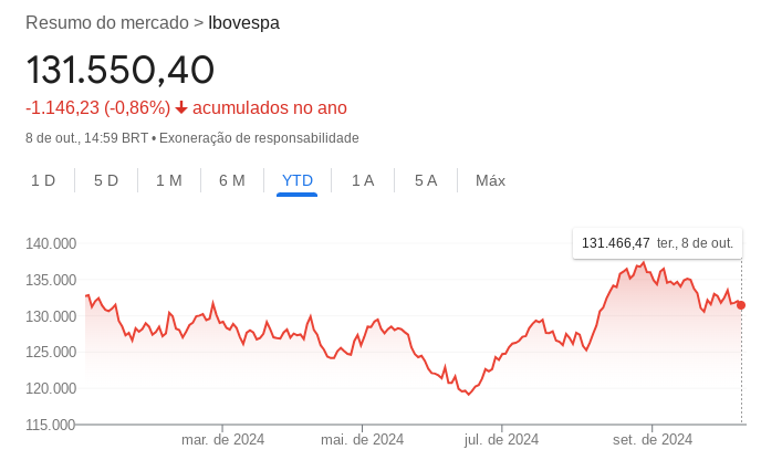 Nesse sentido, a renda variável deixa de ser vantajosa. Por exemplo, em 2024, o principal índice da bolsa, o Ibovespa, vem acumulando desvalorização de 0,86% aproximadamente.