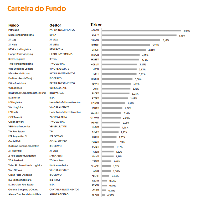 Como já mencionado, ITIT11 investe em uma carteira diversificada de fundos, que replicam a configuração do índice Teva de Fundos Imobiliários de Tijolo. Portanto, segundo o relatório gerencial referente dezembro de 2024, aqui estão os principais fundos que fazem parte do portfólio de ITIT11: