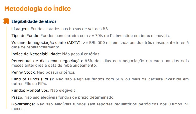 Dessa maneira, a metodologia do índice permite que alguns fundos de tijolo possam fazer parte. Mas para que isso ocorra, eles deverão se enquadrar em algumas regras. Veja mais detalhes sobre elas a seguir: