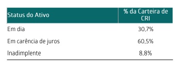Infelizmente o risco se concretizou e com isso, o fundo derreteu junto de seus proventos. Agora, aqueles que possuem cotas do FII na carteira e aqueles que acompanham o fundo de perto, estão na expectativa que parte dos ativos que estão em carência, volte a pagar juros e amortizar.