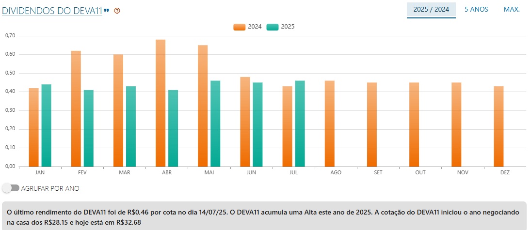 Referente às distribuições, atualmente os proventos giram próximo dos R$ 0,46 por cota, enquanto em outubro de 2024, os pagamentos giravam em R$ 0,45. Desse modo, a única melhora em DEVA11 são as distribuições.
