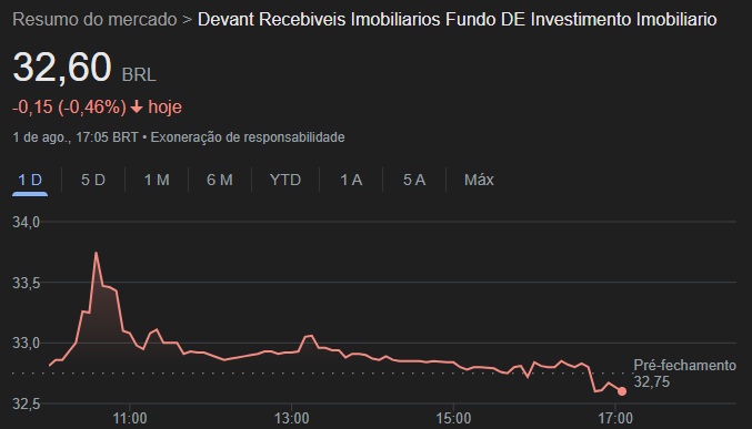 Sobre o valor de mercado do FII, lá em outubro, o fundo podia ser negociado por R$ 34,55, sendo que hoje o valor é de R$ 32,60, um pouco inferior ao valor de outubro de 2024.