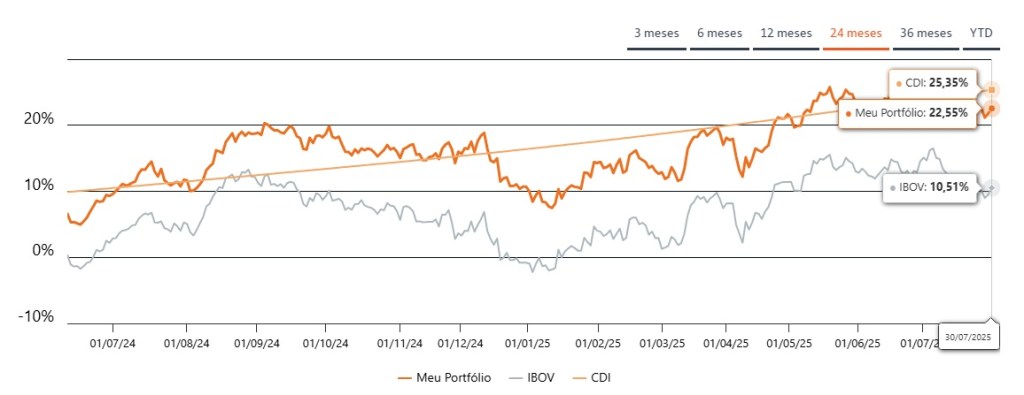 Desse modo, o desempenho de DIVD11 é diferente. Ao analisar a performance do ETF (valorização das cotas mais os proventos) desde o seu início (11/06/2024), DIVD11 está se valorizando em 22,5%.