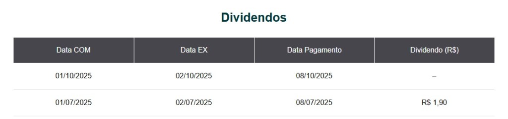 Atualmente o yield deste ativo está na casa dos 1,9% ao trimestre. Sendo que os proventos são pagos trimestralmente. Veja mais detalhes sobre os proventos logo abaixo: