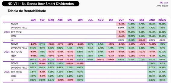 Sobre as distribuições realizadas pelo ETF, de outubro de 2023, quando o fundo foi lançado até junho de 2025, NDIV11 tem gerado proventos acumulados de 14,69%.