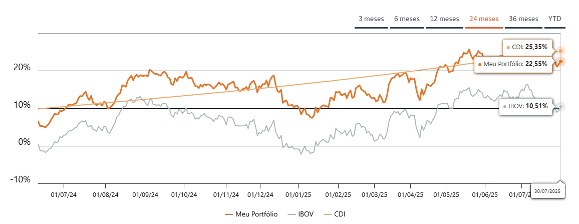 Desse modo, o desempenho de DIVD11 é diferente. Ao analisar a performance do ETF (valorização das cotas mais os proventos) desde o seu início (11/06/2024), DIVD11 está se valorizando em 22,5%.
