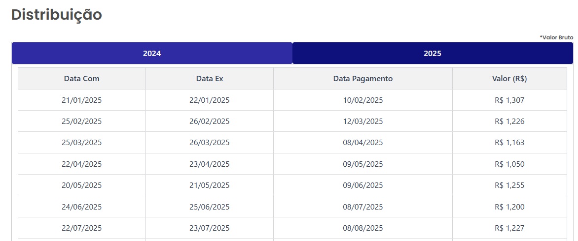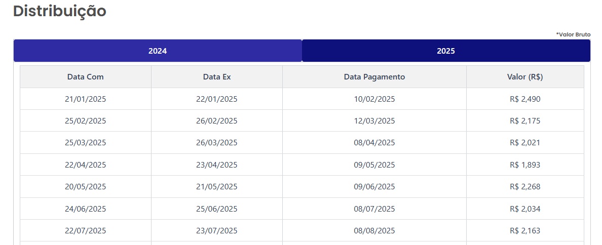 Atualmente o yield deste ativo está na casa dos 1,9% ao trimestre. Sendo que os proventos são pagos trimestralmente. Veja mais detalhes sobre os proventos logo abaixo: