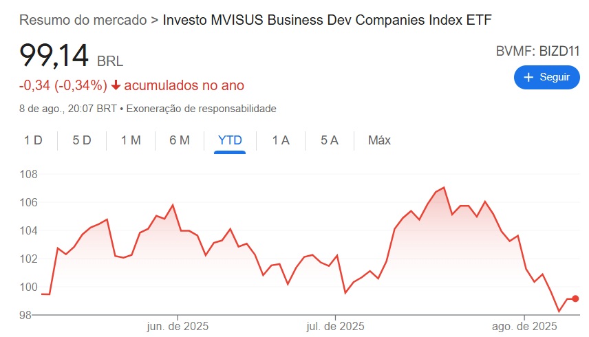 Este ETF segue o índice: MVIS®US Business Development Companies Index que investe em diferentes títulos de crédito privado dos Estados Unidos. O fundo foi lançado no mercado em maio de 2025, portanto ele é considerado novo.