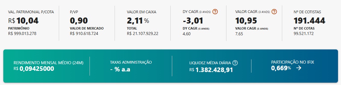 Atualmente a rentabilidade do fundo está em 1,09%, já que o último provento pago foi de R$ 0,10 e o valor da cota está em R$ 9,15. Nos últimos 12 meses o yield tem ficado em 12,34%.