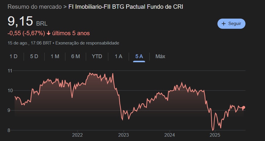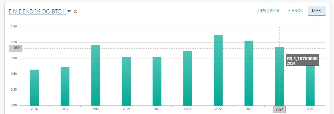 Em 2025 BTCI11 está obtendo ganhos na ordem dos 3,74%. Já nos últimos 5 anos, essa performance é pior, uma vez que o FII está registrando perdas de 5,67%.