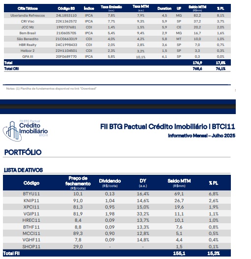 Com uma carteira repleta de CRIs e demais títulos atrelados a imóveis, BTCI11 possui um portfólio com 79% de CRIs e 21% de FIIs, segundo o relatório gerencial de julho de 2025.