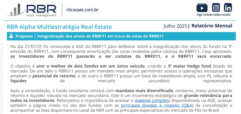 Com essa incorporação, o RBRX11 se tornará o terceiro maior “Hedge Fund” do mercado de fundos imobiliários brasileiro. Veja mais detalhes abaixo no trecho do relatório gerencial de RBRX11 referente julho/2025: