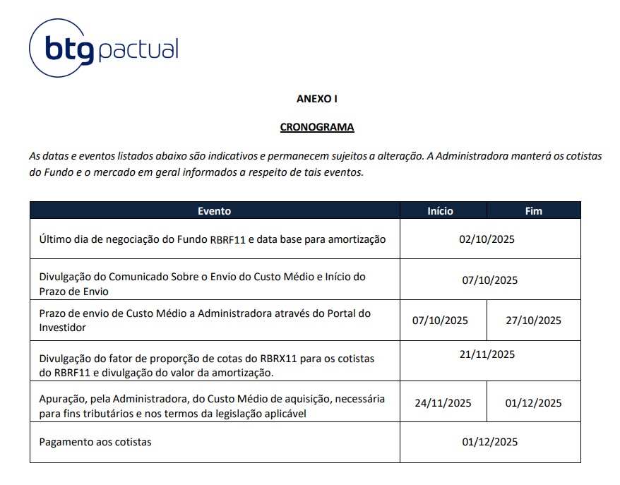 Segundo o cronograma, ainda não há maiores informações sobre a proporção de cotas que os investidores de RBRF11 vão receber de RBRX11 e se haverá algum valor amortizado.