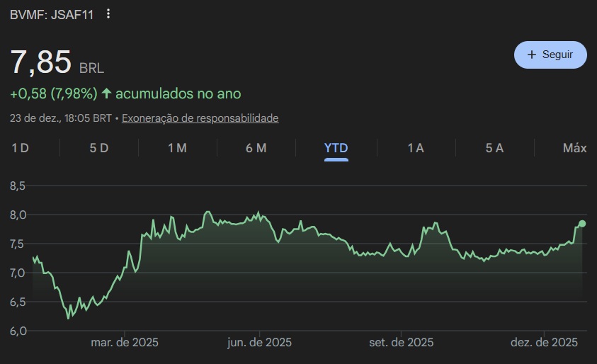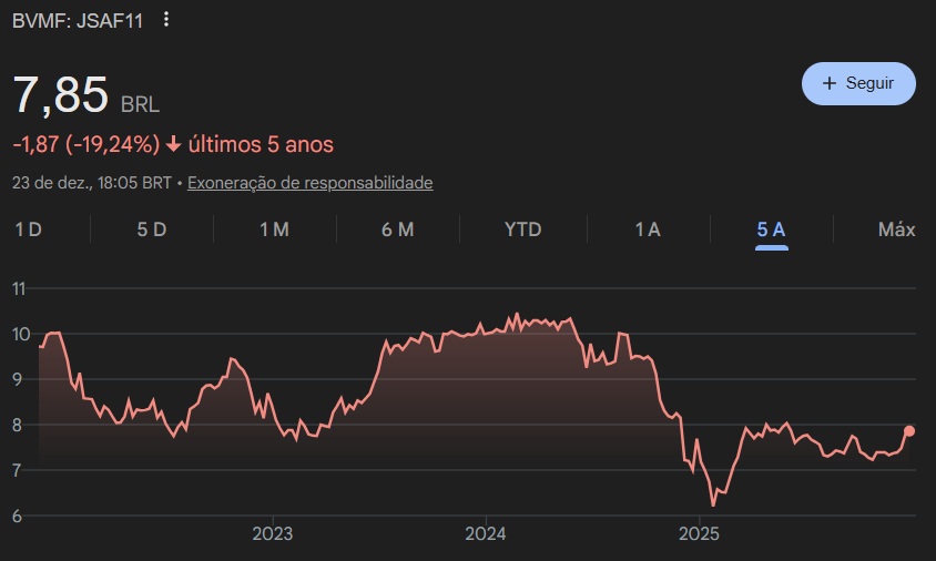 JSAF11 é um fundo de fundo administrado e gerido pelo banco Safra. Segundo o relatório gerencial de outubro de 2025, o valor patrimonial por cota do FII é de R$ 8,95, enquanto o valor de mercado é de R$ 7,85.