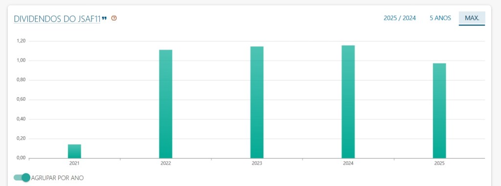 Em 2025, a performance de JSAF11 está em 7,98%, enquanto nos últimos 5 anos o desempenho é de (-19,24). Ou seja, no atual ano o FOF está indo “ok”, mas nos últimos 5 anos o desempenho tem sido ruim. Mas, como boa parte dos fundos, o que compensa são os proventos, que quando bem investidos, podem gerar ganhos consistentes e compensar a desvalorização da cota.