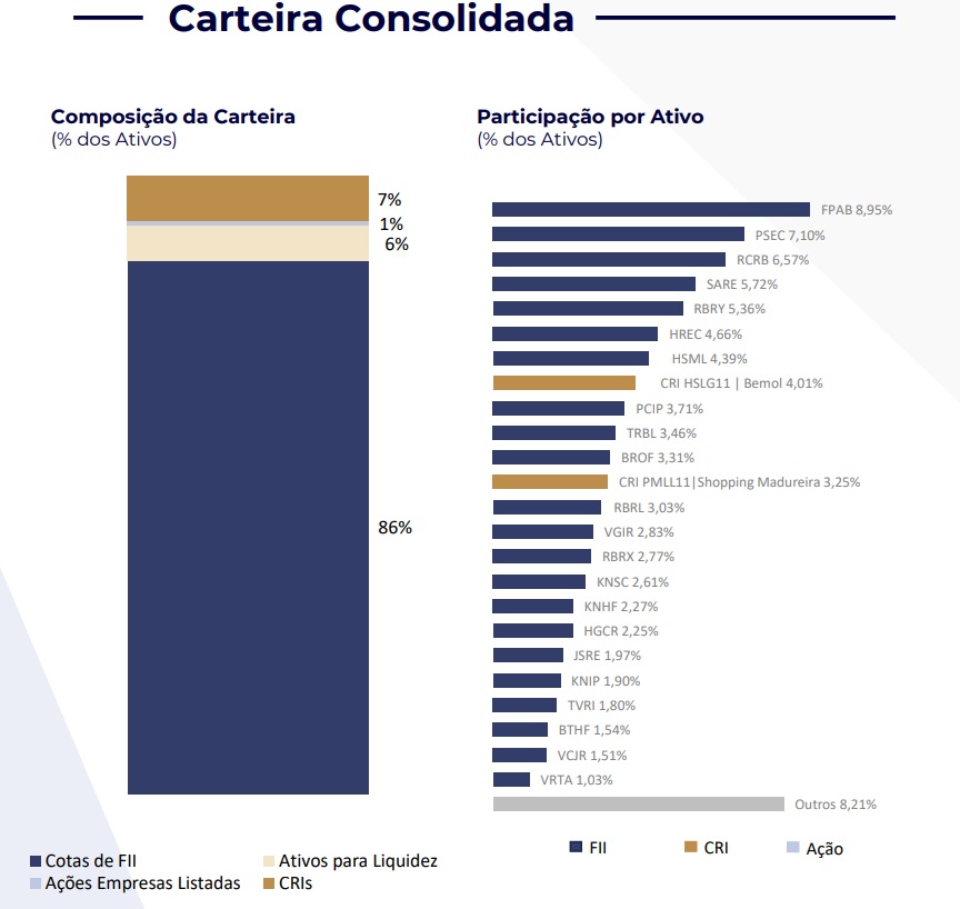 De acordo com o relatório gerencial de novembro de 2025, JSAF11 possui uma carteira com 86% do PL investido em cotas de outros FIIs, 7% investido em CRIs, 6% em ativos de liquidez e 1% em ações listadas na bolsa.
