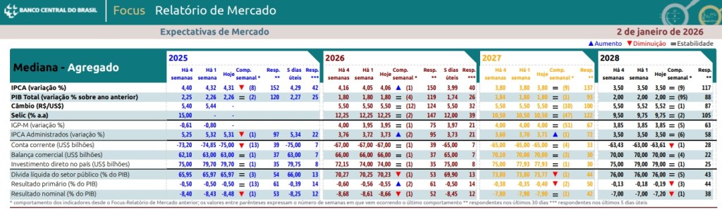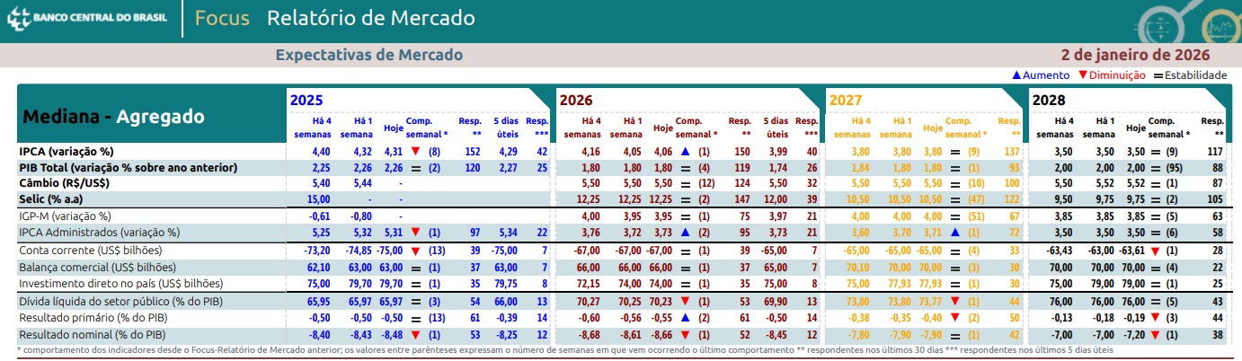 Se ainda em 2025, o Focus projetava uma inflação em 4,32%, agora, no Boletim divulgado em 05.01, a expectativa é de inflação em 4,31%.
