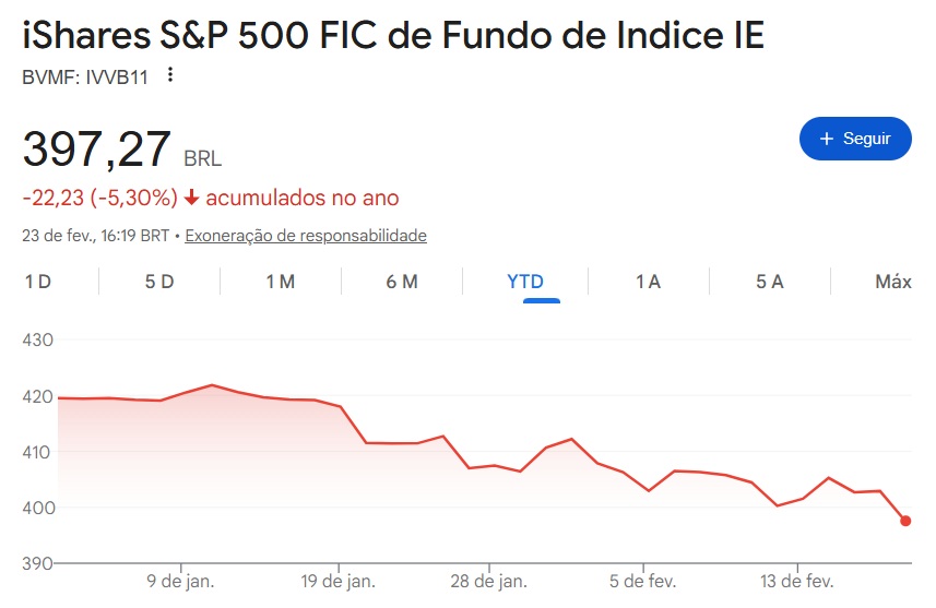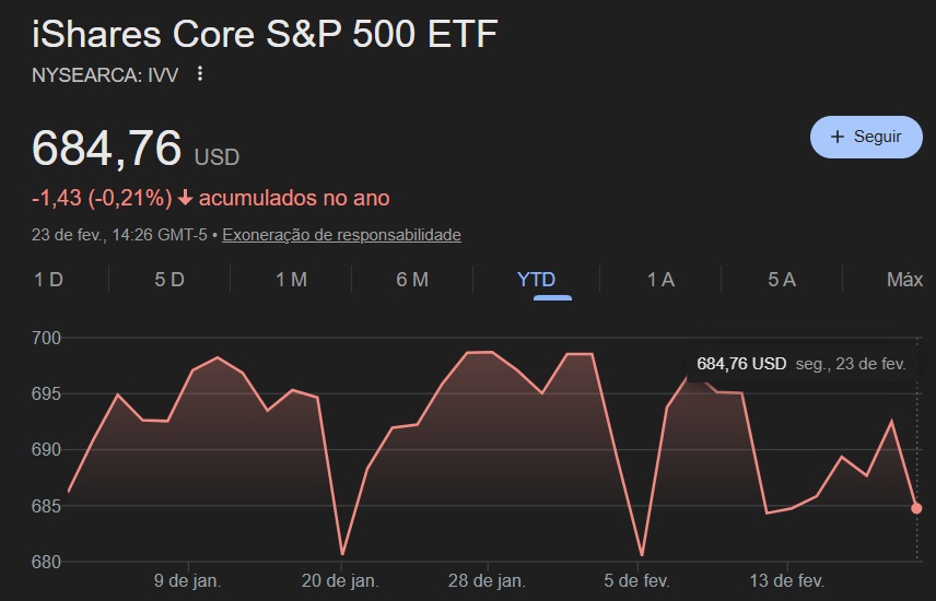 Um caso assim é o ETF IVVB11 (que está posicionado no ETF norte-americano IVV). Desse modo, ao analisar o desempenho de IVV nos Estados Unidos, identificamos a desvalorização de 0,21% em 2026.