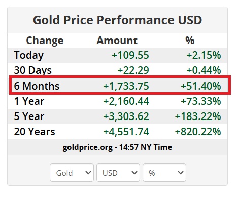 O ouro também é outro ótimo exemplo. Nos últimos 6 meses, o ouro cotado nos Estados Unidos obteve uma valorização de 51,40%.