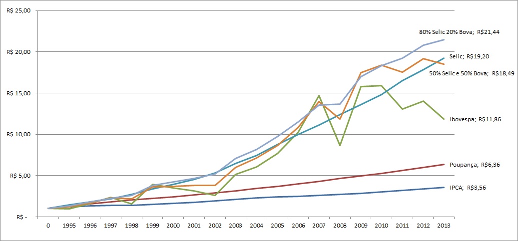 Simulamos um investidor que aplicou R$: 1,00 na poupança, o mesmo valor no índice Ibovespa, o mesmo valor em uma aplicação indexada a Selic e caso o investidor tenha feito uma alocação de ativos de R$: 0,50 em Ibovespa, e R$: 0,50 na Selic (50%/50%) e por fim se o investidor realizasse a alocação em R$: 0,80 Selic e os outros R$: 0,20 em Ibovespa (80%/20%). O período da aplicação foi do inicio de 1995 até o final de 2013.