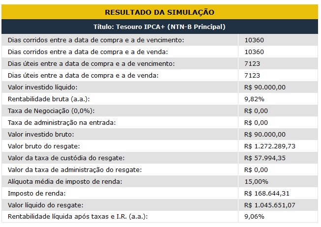 Um milhão de reais, melhor, mais do que um milhão, e já liquido de imposto de renda! Tudo isso por meio de um investimento de R$ 90.000,00!