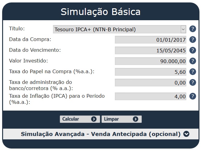 O vencimento, no caso é referente ao título de 2045. Aqui também vai depender de quando você vai querer o seu dinheiro de volta. Novamente, quanto mais tempo, menos dinheiro pode ser empregado na aplicação.