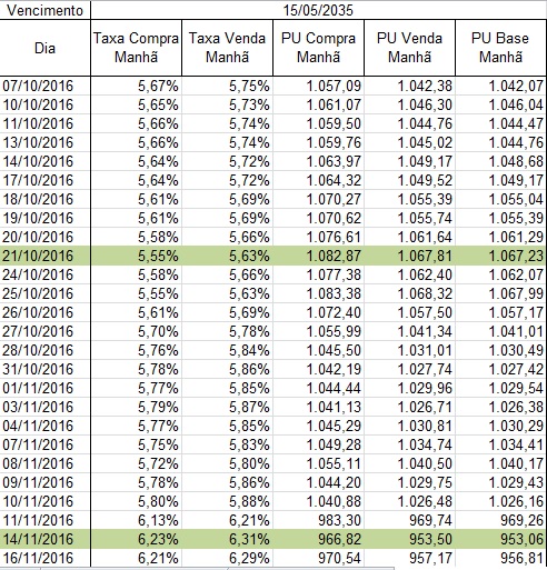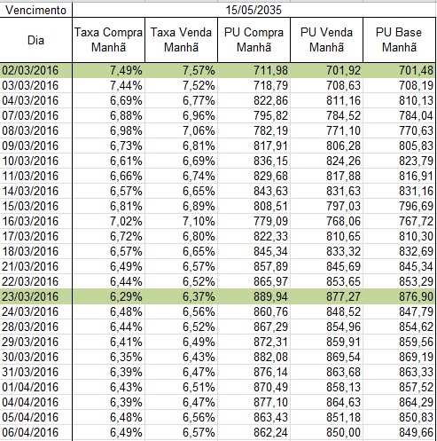 Assinalado em verde está valores que vamos pegar como exemplos. Vamos imagina que o investidor tenha comprado em 02/03/2016 10 letras do Tesouro IPCA + Principal com vencimento para 2035. Ou seja, o investidor investiu nada mais do que R$ 7.014,80 (pegando o valor do PU Base Manhã).