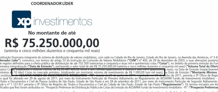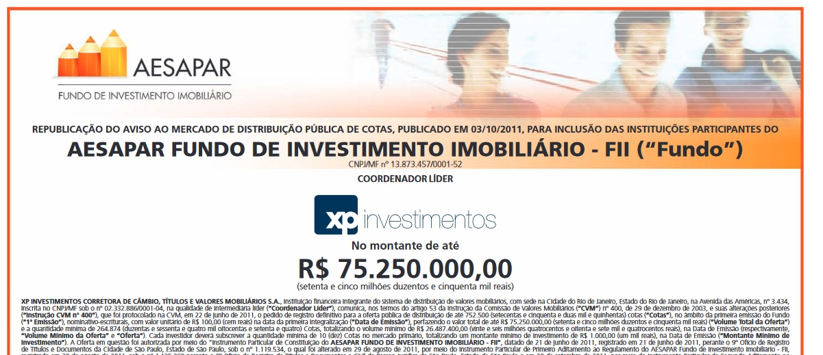 Por exemplo, temos no mercado, fundos que possuem cotas negociadas a partir dos R$ 1.000,00, ou até mais! Segue imagem da oferta pública do FII AEFI11: