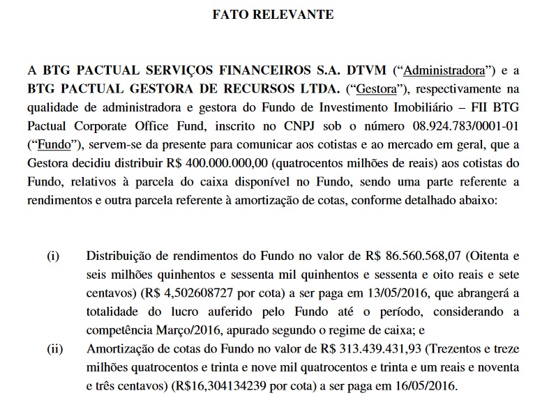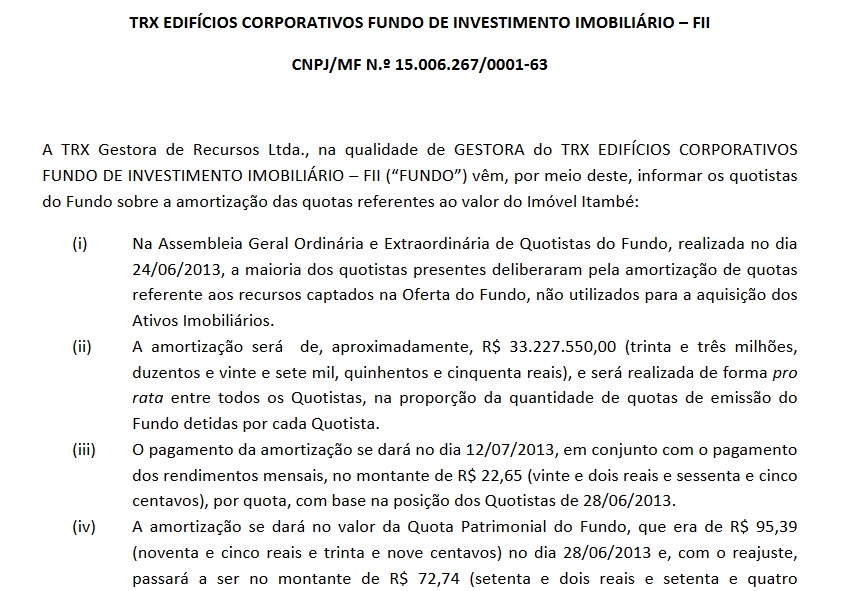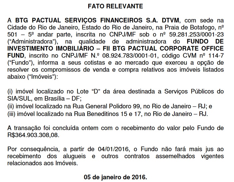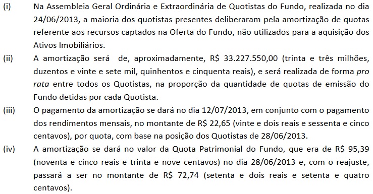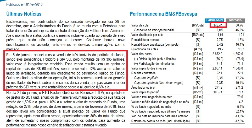 No caso de BRCR11 o negócio foi melhor ainda, uma vez que o fundo amortizou parte das cotas. Fato que ocorreu devido à venda de alguns imóveis da carteira.