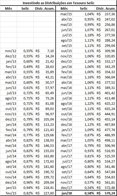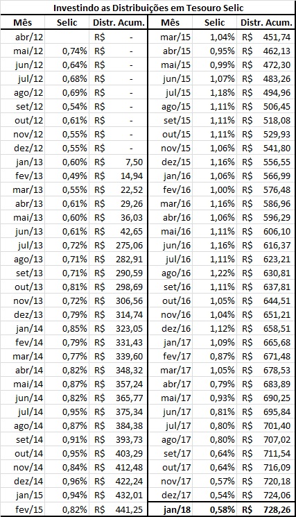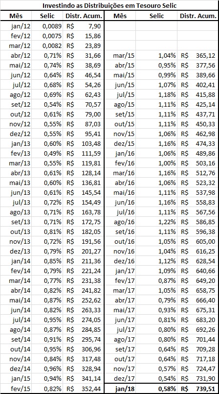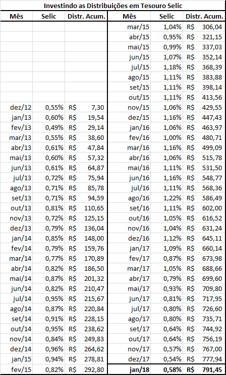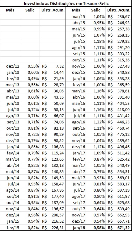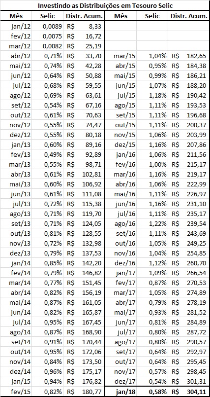 Enfim, comparado com outros fundos, como KNRI11 ou BRCR11, a volatilidade de fundos como FEXC11 ou MXRF11 (XPGA11) não é tão grande assim. Segue tabela com a simulação das distribuições investidas no Tesouro Selic.