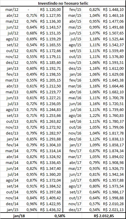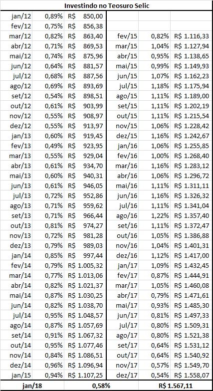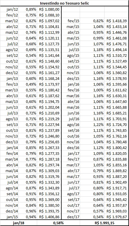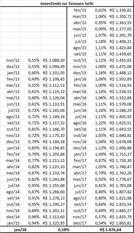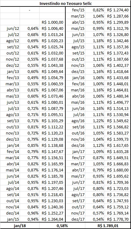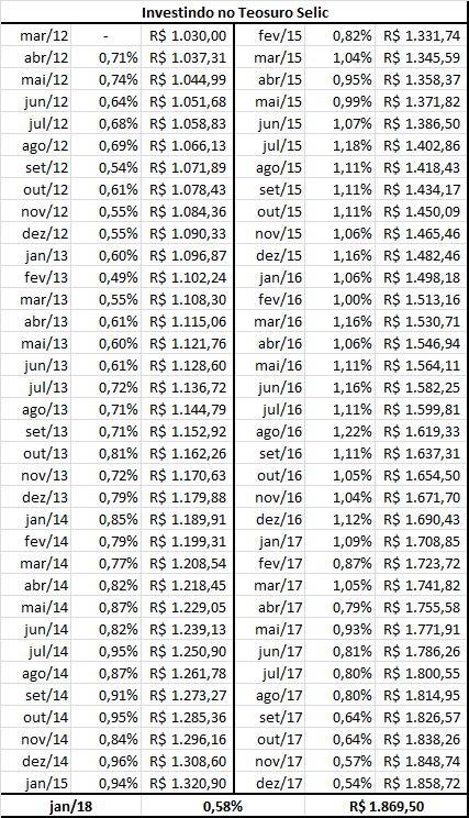 Na segunda tabela o investidor terá o resultado do investimento de R$ 1.000,00 em Tesouro Selic até o presente momento.