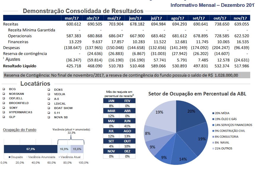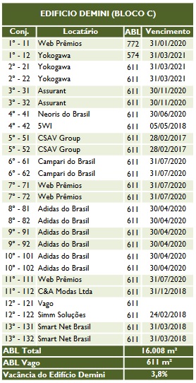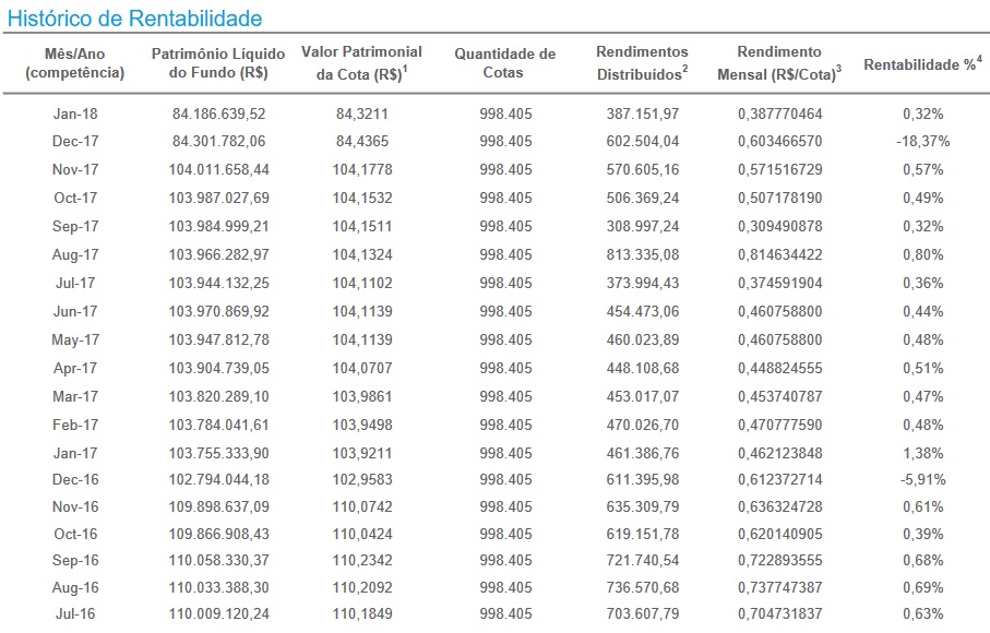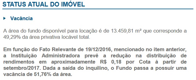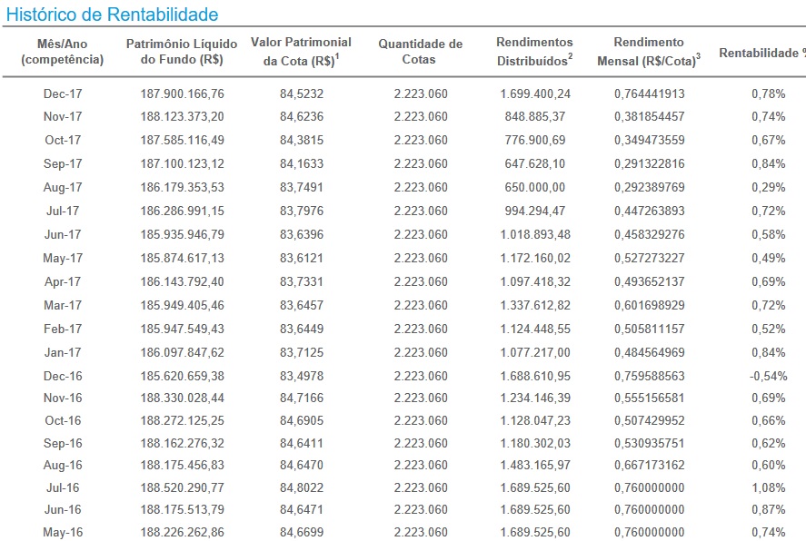Minha análise não vai mais além do que isso. Mas outros fundos como BRCR11, KNRI11 conseguiram rentabilidade no período superior, e eles também tinham diversificação de inquilinos.