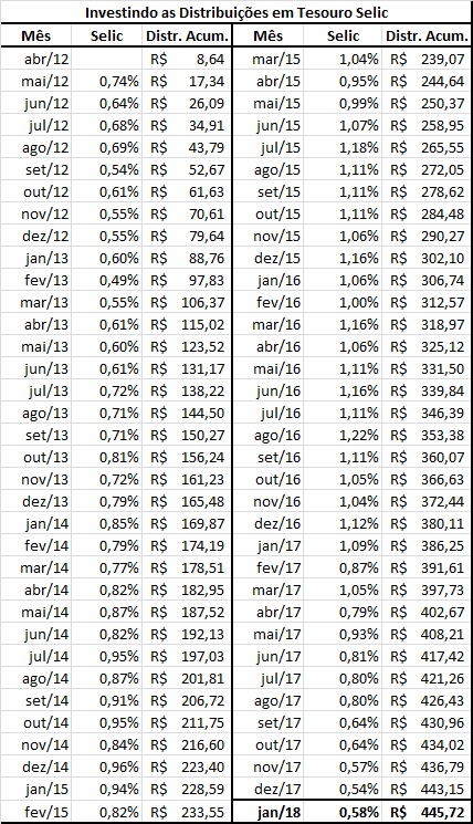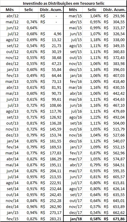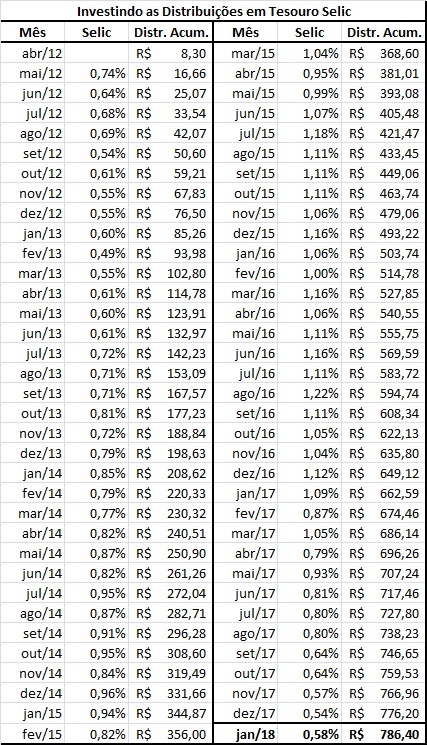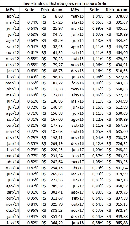 Levando em consideração que o valor teórico de construção da carteira foi de R$ 5.000,00, o saldo final dela, em Janeiro de 2018 seria de aproximadamente R$ 8.358,37! Nesse valor estamos somando as distribuições corrigidas pela Selic.