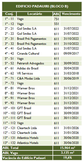 Sendo que boa parte do espaço está locado para BR Foods. Vale destacar que o vencimento de grande parte dos contratos junto a BR Foods é para 2028!