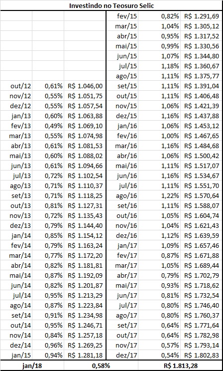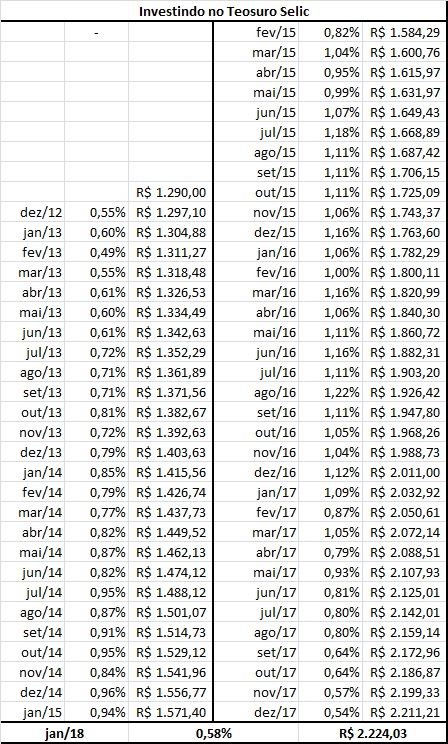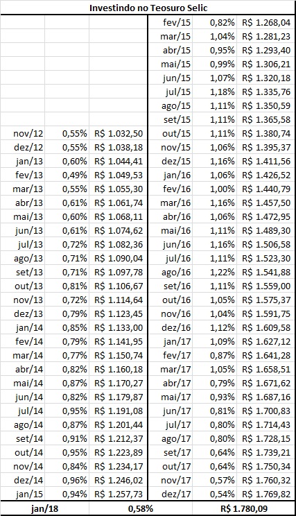 O resultado final foi bem interessante (segunda tabela). Em um período de pouco mais de 5 anos o investidor teria mais de 70% de ganho ao investir no Tesouro Selic.