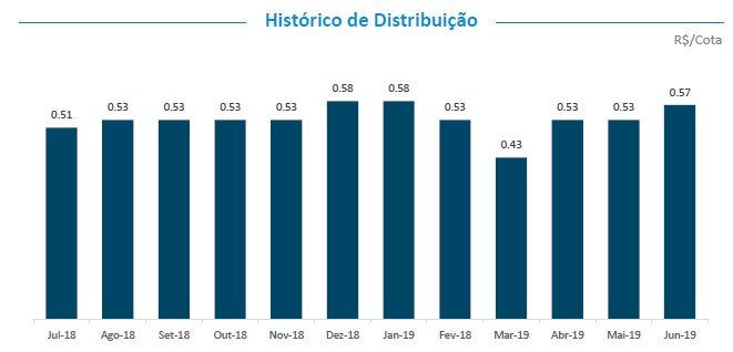 Sendo que a rentabilidade, nos últimos 12 meses está na casa dos 7,7% ao ano (levando em conta somente as distribuições). Segue os valores referentes às últimas distribuições;