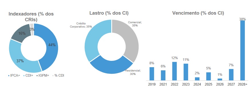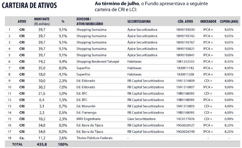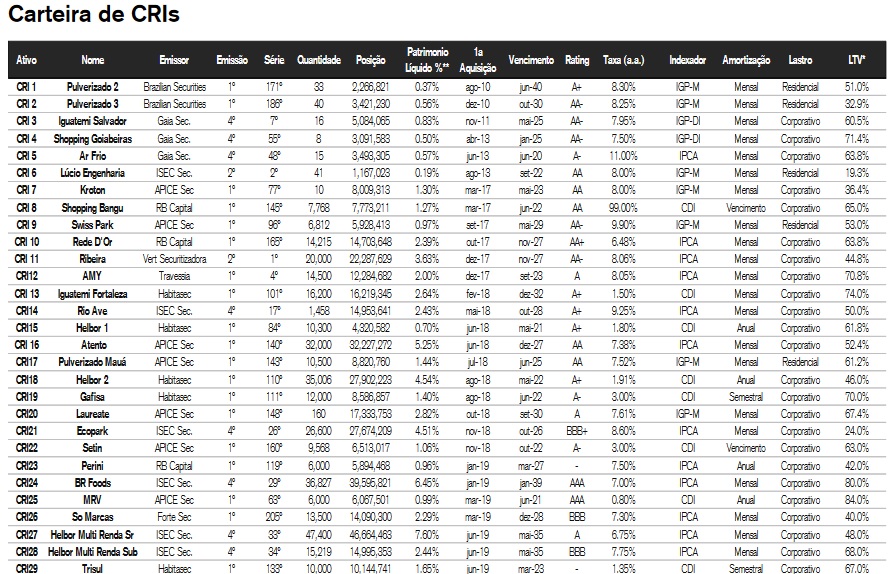 A carteira do FII é bem extensa, havendo vários CRI na carteira, sendo que o fundo vem registrando boa rentabilidade.
