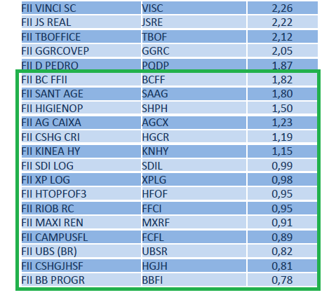 Com o intuito de reduzir essa lista, deixando somente os fundos que compreendo serem os mais relevantes, a lista fica com 7 fundos. Esses FII são;