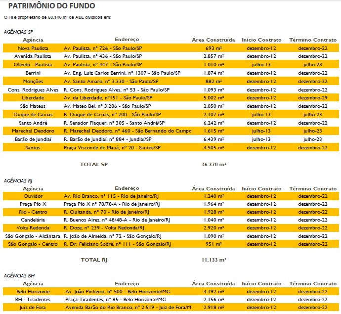 Analisando o relatório gerencial de SAAG11 referente ao mês e maio, podemos ver que existem participações em agências dos estados de; São Paulo, Rio de Janeiro, Minas Gerais, Rio Grande do Sul, entre outros. Os contratos de locação que o fundo tem com as agências são atípicos.